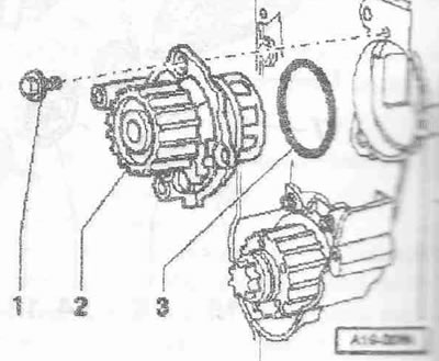 Слить ОЖ. Снять зубчатый ремень. Вывернуть болты «1» и снять насос ОЖ «2». Снять уплотн. кольцо «3».