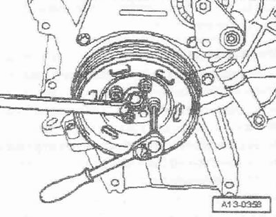 Снять поликлиновой ремень. Отвернуть демпфер, удерживая центральный болт накидным гаечным ключом.