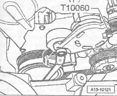 Для ослабления натяжения поликлинового ремня отклонить натяжитель накидным гаечным ключом в направлении «стрелки». Зафиксировать натяжитель, установив стопорный штифт «Т10060 А» или «Т10060» в стопорные отверстия. Снять поликлиновой темень.