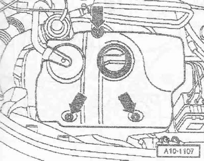 Снять капот двигателя. Снять крышку двигателя «стрелки». Снять расположенный ниже шумоизоляционный экран, для чего отсоединить шланг вентиляции картера.