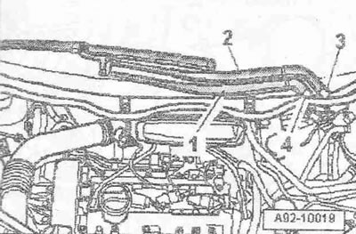 Отсоединить штекерный разъем «2» расходомера воздуха «g70». Отсоединить вакуумный шланг «1». Разжать зажим шланга «4» и снять воздуховод с расходомером воздуха «G70». Поз. «3» не учитывать.