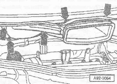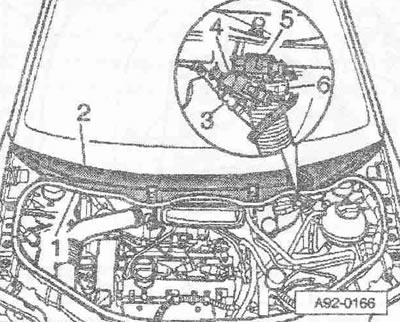 При помощи отвертки снять колпачки 3- и «4» с рычагов стеклоочистителей.. Отвернуть гайки на обоих рычагах на несколько оборотов. Освободить рычаги «1» и «2», слегка отклонив их на осях стеклоочистителей. Полностью отвернуть гайки и снять рычаги стеклоочистителя. Отсоединить трубку жидкости стеклоомывателя «3». Отсоединить штекерные разъемы «4» и «5» обогреваемых форсунок омывателя. Разжать зажим для шлангов «6» при помощи зажимных клещей для шлангов «VAG 1921» снять сливной шланг с решетки обтекателя. Сиять резиновый уплотнитель «1» решетки обтекателя. Снять решетку обтекателя «2». Высвободить трубку жидкости стеклоомывателя.