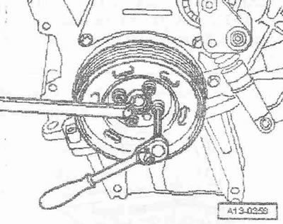 Отвернуть демпфер, удерживая центральный болт накидным гаечным ключом.