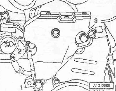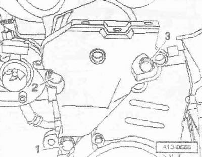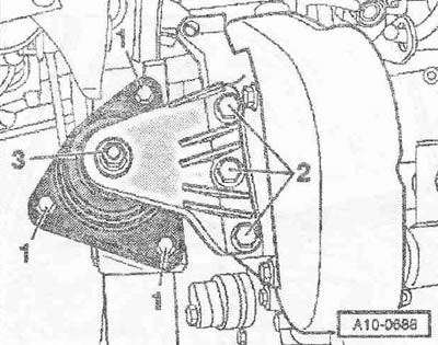 Вывернуть болты «1» и «2» и снять кронштейн с подушкой двигателя. Вывернуть болты «2» и «3» и снять опору двигателя.