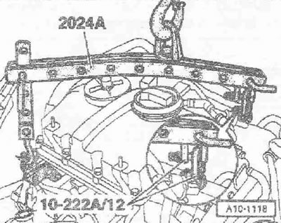 Установить 2 серьги «10-222 А/12» на заднюю левую грузовую проушину «Т4001б» на ГБЦ. Закрепить приспособление для вывешивания «2024 А» на двигателе и на траверсе «10-222 А», как показано на рисунке.