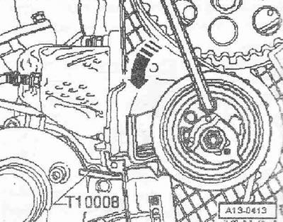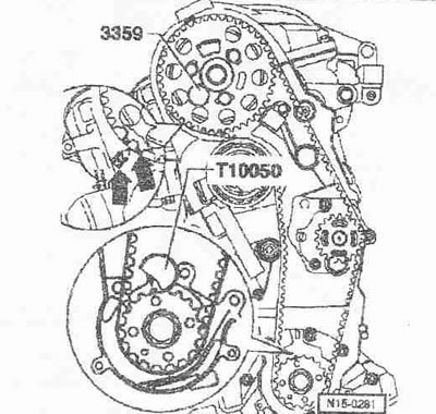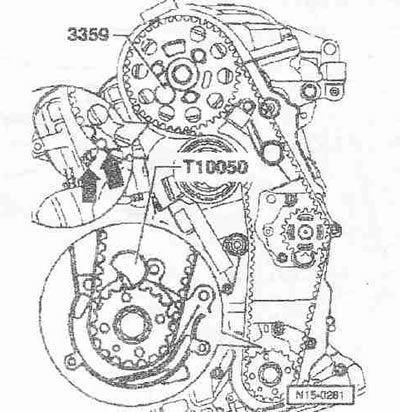 Распредвал зафиксирован штифтами «3359». Коленвал зафиксирован стопором коленвала «Т10050». Натяжной ролик застопорен при помощи фиксирующей пластины «Т10008».