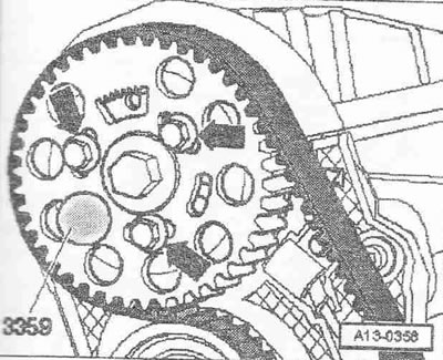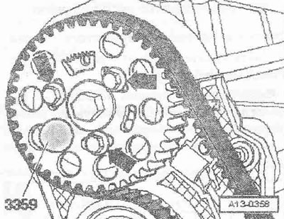 Затянуть болты «стрелки» шестерни распредвала моментом 25 Нм. Вынуть стопорный штифт «3359» и стопор коленвала «Т10050».