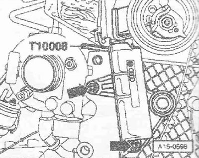 Вставить ключ с внутренним шестигранником до упора в шестигранное отверстие и повернуть натяжной ролик против часовой стрелки «стрелка», пока натяжитель не будет застопорен с помощью фиксирующей пластины «Т10008».