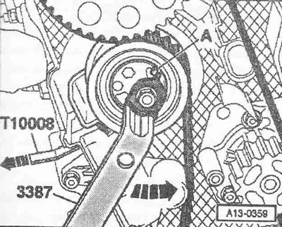 Не полностью ввернуть болты «стрелка». Шестерня распредвала должна вращаться и не должна качаться. Повернуть шестерню распредвала в пазах по часовой стрелке до упора. Установить зубчатый ремень на шестерню распредвала, натяжной ролик, шестерню коленвала и в последнюю очередь на шестерню насоса ОЖ. Установить натяжитель зубчатого ремня. Отрегулировать натяжение зубчатого ремня следующим образом: повернуть эксцентрик при помощи ключа под 2 отверстия «3387» против часовой стрелки «стрелка» до упора «А». Вынуть фиксирующую пластину «Т10008».