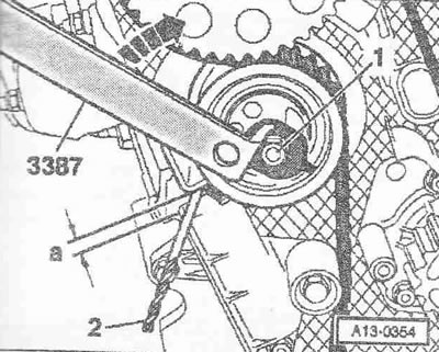 Повернуть коленвал на 2 оборота в направлении вращения двигателя, чтобы коленвал установился почти в ВМТ. Убедиться в том, что расстояние «а» между рычагом и корпусом натяжителя достаточно. Расстояние «а» = 7,0±1,0 мм. Если расстояние «а» недостаточно, отрегулировать натяжной ролик следующим образом: зафиксировать натяжной ролик при помощи ключа под 2 отверстия «3387», отвернуть гайку «1» и повернуть ключ «в направлении стрелки» до тех пор, пока расстояние «а» не будет достаточным. Расстояние «а» - 7,0±1,0 мм. Удерживать натяжной ролик в этом положении и затянуть гайку натяжного ролика моментом 20 Нм + 45°.