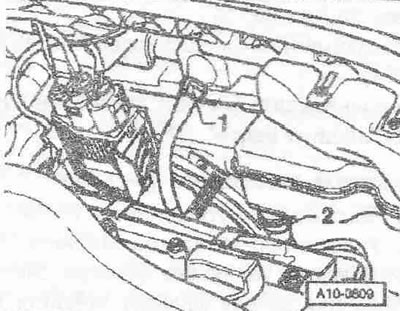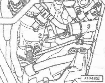 Вынуть маслоизмерительный щуп из направляющей трубки. Снять направляющую трубку «1» маслоизмерительного щупа. Снять маслозаливную трубку «2» с масляного бака. Высвободить электропроводку, ведущую к датчику уровня и температуры масла «G266» и к датчику частоты вращения двигателя «G28», из держателя масляного фильтра. Снять шум о изоляционный экран. Отсоединить штекерный разъем датчика давления масла -Fl «поз. 1». Поставить приспособление для откачки масла «V.A.G 1782» под двигатель. Вывернуть датчик давления масла. Снять напорную масляную магистраль, ведущую к турбонагнетателю, с держателя масляного фильтра «2». Поз. «3» не учитывать.