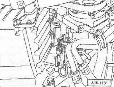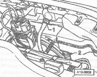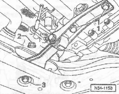 Вынуть маслоизмерительный щуп из направляющей трубки. Снять направляющую трубку масло измерительного щупа. Поз. «2» не учитывать. Снять правое переднее колесо. Снять шумоизоляционный экран «стрелки». Поставить приспособление для откачки масла «V.A.G 1782» под двигатель. Слить масло. Слить трансмиссионное масло. Отсоединить штекерный разъем датчика уровня и температуры масла «G266». Высвободить электропроводку, ведущую к датчику уровня и температуры масла «G266» и к датчику частоты вращения двигателя «G28», из держателя масляного фильтра.
