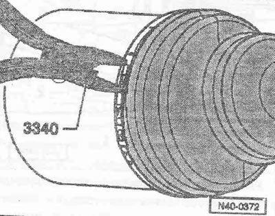 Для повторной установки отметить монтажное положение приводного вала к полуоси с фланцем на КП. На пылезащитном чехле со стороны КП разжать зажим для шланга при помощи клещей «3340».