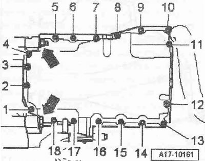 Перекрестно ослабить болты «1...18» и вывернуть их. Снять масляный подо,он, используя при необходимости резиновый молоток.