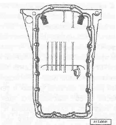 Установка в обратном порядке, при этом необходимо удалить остатки герметика с масляного поддона и блока цилиндров, например, с помощью вращающейся пластмассовой щётки. Очистить посадочные поверхности; на них не должно быть масла и смазки. Отрезать носик тюбика по передней отметке (О отверстия прибл. 2 мм). Нанести герметик на чистую посадочную поверхность масляного поддона, как показано на рисунке.