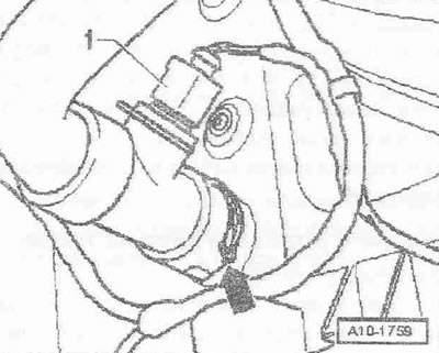 Отсоединить штекерный разъем «1» датчика ОЖ на выходе из радиатора «G83». Снять зажим и вытянуть датчик температуры ОЖ на выходе из радиатора «G83».