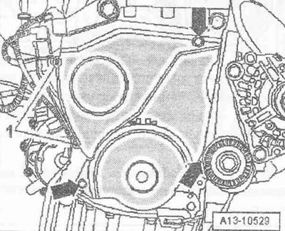 Снять нижнюю крышку для зубчатого ремня, для этого выкрутить болты «стрелки» и открыть зажимы «1».