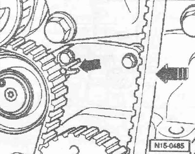 Наблюдать положение указателя «стрелка слева» натяжного ролика и сильно нажать большим пальцем на зубчатый ремень «стрелка справа». Стрелка должна двигаться в сторону. Отпустить ремень. Повернуть коленвал в направлении вращения двигателя на 2 оборота. Проверить положение указателя натяжного ролика. Указатель должен встать обратно в своё исходное положение. Если указатель не находится в исходном положении, то заменить натяжной ролик.