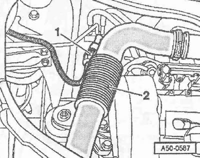 Снять с воздуховода электромагнитный клапан 1 абсорбера «N80» поз. «1» с кронштейном. Снять воздуховод «2», для этого ослабить пружинные хомуты клещами для шланговых хомутов «V.A.G-1921» «стрелки».