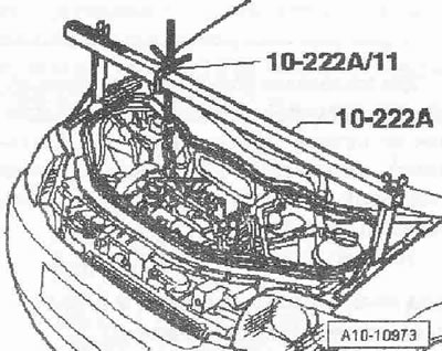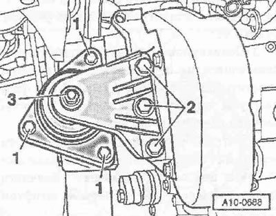 Установить траверсу «10. 222 А» на соединительные кромки крыльев. Ходовой винт расположен сзади. Навесить крюк-карабин шпинделя «10. 222 А /11» на правой проушине двигателя. Предварительно зажать двигатель ходовым винтом, не поднимать. Откручивать гайку «3» только после замены подушки двигателя. Выкрутить болты -1. и «2» и снять консоль с опорой двигателя.