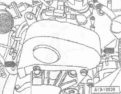 Снять капот двигателя. Снять поликлиновый ремень. Снять верхнюю крышку зубчатого ремня, для этого открыть стяжные хомуты «стрелки».