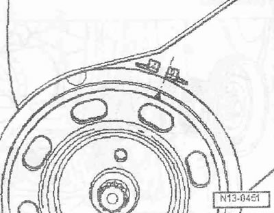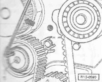 Установить коленвал в направлении вращения двигателя в "ВМТ". Риска на шкиве поликлинового ремня для коленвала должна совпадать с краем отметки «0».