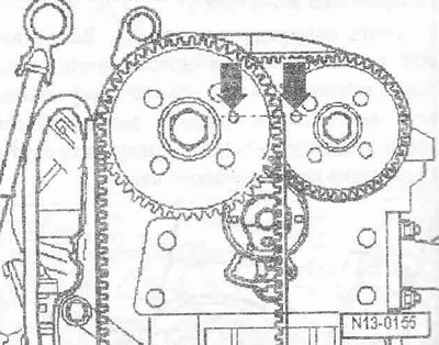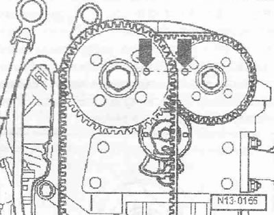 Отверстия для фиксации в звездочках распредвалов должны совпасть с калибровыми отверстиями в картере распредвалов «стрелки».