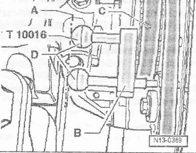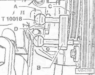 Вставить стопорные штифты «D» фиксатора распредвалов «Т10016» до упора в калибровые отверстия в корпусе подшипников распредвалов следующим образом: Через фиксирующее отверстие шестерни распредвала впускных клапанов «С». Через фиксирующее отверстие шестерни распредвала выпускных клапанов. Ручки стопорные штифтов должны при этом находиться на одной высоте «линия А». Вдвинуть до упора держатель «В» в шестерню распредвала впускных клапанов. Снять подушки двигателя.