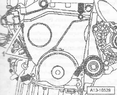 Проверить, вставляются ли снова стопорные штифты «D» фиксатора распредвалов «Т10016» до упора в калибровые отверстия в корпусе подшипников распредвалов следующим образом: через фиксирующее отверстие шестерни распредвала впускных клапанов «С». Через фиксирующее отверстие шестерни распредвала выпускных клапанов. Если отверстия не соосны, то настройку повторить. Установка в обратном порядке, при этом необходимо установить шкив поликлинового ремня для коленвала, установить подушку двигателя.