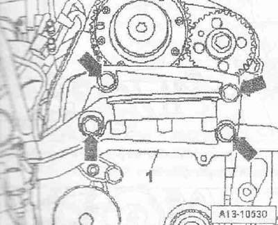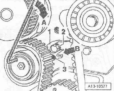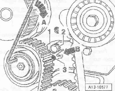 Натянуть зубчатый ремень, для этого поворачивать натяжной ролик по часовой стрелке стрелка А-, пока указатель «3» не станет над риской «стрелка В» в основной пластине «1». Затянуть болт для натяжного ролика зубчатого ремня для основного привода. Снять фиксатор распредвалов «Т10016». Провернуть коленвал в направлении вращения двигателя на 2 оборота и снова установить в "ВМТ".