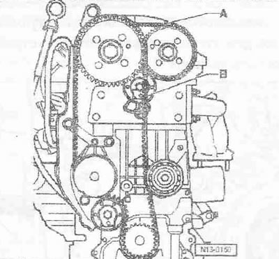 Надеть зубчатый ремень для основного привода «В» в последовательности, насос ОЖ, натяжной ролик, коленвал и распредвал впускных клапанов.