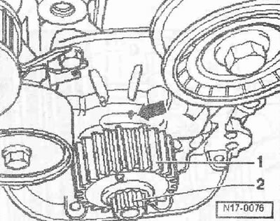 Осторожно! Опасность повреждения двигателя. Чтобы воспрепятствовать сползанию шкива ремённой передачи на коленвале с ведущего шкива, запрещается проворачивать коленвал при ослабленном шкиве поликлинового ремня. Перед поворотом коленвала зафиксировать шестерню зубчатого ремня для коленвала болтом и 2 подкладными шайбами.