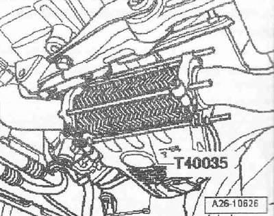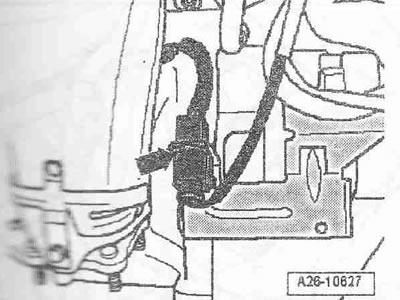 Снять капот двигателя. Снять шумоизолирующий кожух, ослабить для этого крепёжные детали. Разъёмный элемент защитить фиксатором «Т40035» от изгиба.