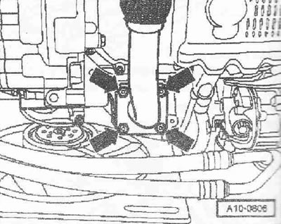 Выкрутить болт «стрелка» для кронштейна выпускного коллектора.
