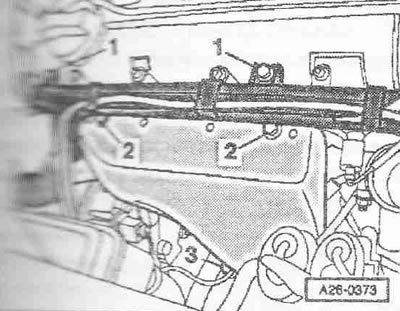 Выкрутить болты «1» и снять проводку с блока подшипников распредвалов. Выкрутить болты «2» и «3» и снять теплозащитный экран.