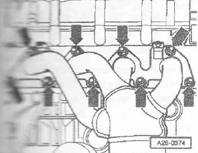 Выкрутить болты «стрелки» крепление приёмной трубы к выпускному коллектору.