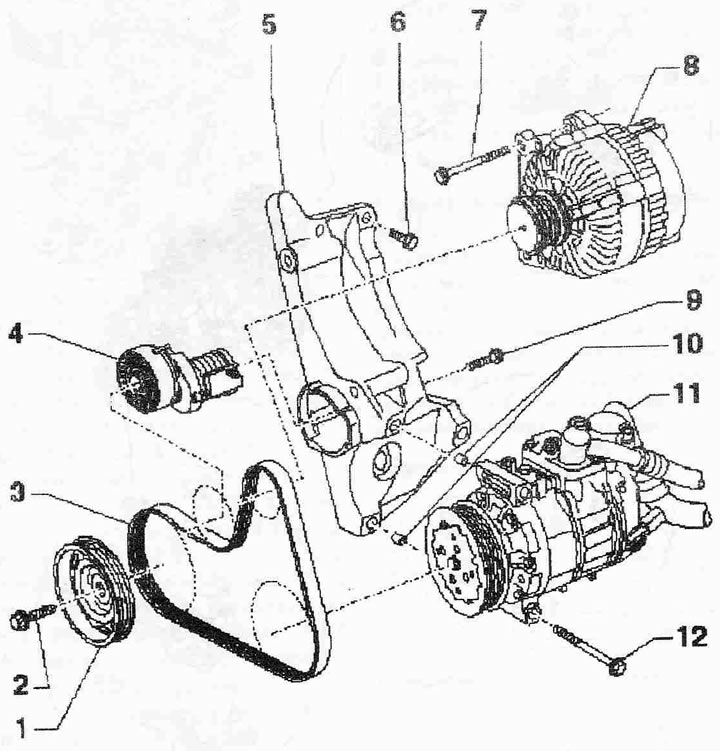 3. Поликлиновый ремень, проверить степень износа, не перегибать, перед снятием отметить направление хода мелом или фломастером. При установке следить за правильным положением на ременных шкивах