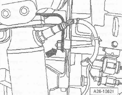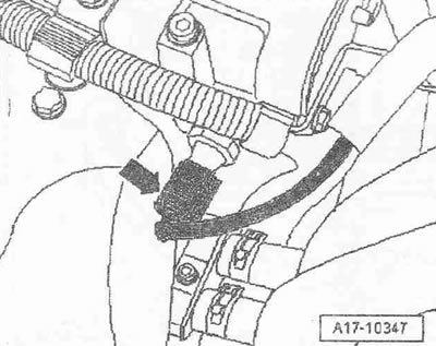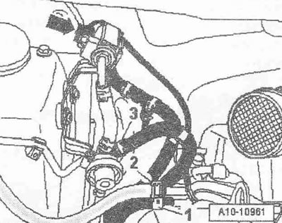 Снять топливные шланги «1» и «3». Снять шланг «2» с абсорбера. «Стрелку» не учитывать. Открутить болты «стрелки» и снять теплозащитный экран.