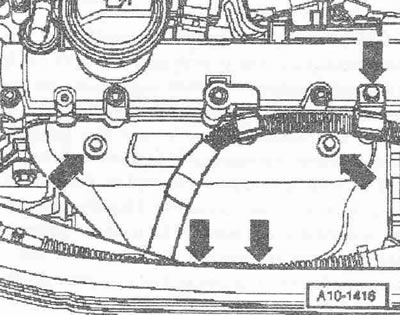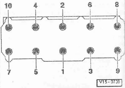 Осторожно! Опасность повреждения уплотн. поверхности. Осторожно удалить с ГБЦ и блока цилиндров остатки герметика. Не допускать образования длинных царапин или задиров. Опасность повреждения блока цилиндров. В глухих отверстиях болтов крепления ГБЦ не должно быть масла или ОЖ. Опасность негерметичности прокладки ГБЦ. При ремонте осторожно удалить с ГБЦ и блока цилиндров остатки герметика. Не допускать образования длинных царапин или задиров. Осторожно удалить остатки наждака и шлифовки. Новую прокладку ГБЦ следует вынимать из упаковки непосредственно перед установкой. Для предотвращения повреждения силиконового слоя и пазов прокладки ГБЦ следует особо осторожно обращаться с прокладкой. Опасность повреждения открытых клапанов. При установке обменной ГБЦ следует снимать пластиковый цоколь для защиты открытых клапанов лишь при непосредственном соприкосновении его с ГБЦ. Заменить болты, которые затягивались с доворотом. Заменить самостопорящиеся гайки, манжетные уплотнения, прокладки и уплотн. кольца. Заменить сетчатый масляный фильтр в ГБЦ. Перед установкой обменной ГБЦ необходимо смазать маслом прилегающие поверхности гидрокомпенсаторов, коромысел и рабочие поверхности кулачков, прежде чем устанавливать корпус подшипников распредвалов. Закрепить всех шланговые соединения хомутами соответствующей серии. После замены ГБЦ или прокладки ГБЦ необходимо полностью заменить ОЖ и масло. Закрыть открытые детали двигателя.