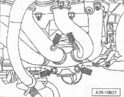 Выкрутить гайки «стрелки» соединения предкатализатора на выпускном коллекторе. Снять кронштейн выпускного коллектора.
