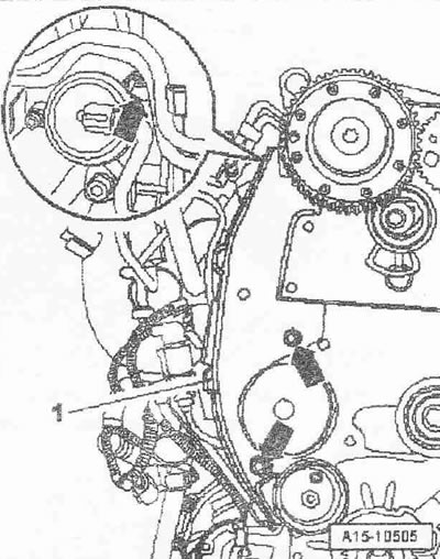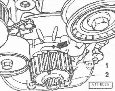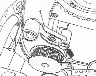 Выкрутить болты «стрелки» и снять заднюю крышку «1» зубчатого ремня.