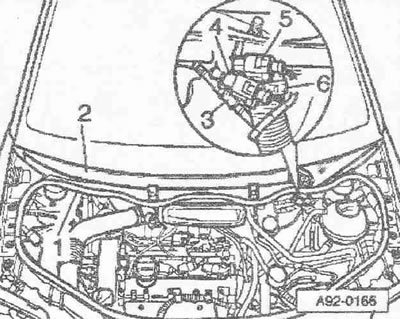Отсоединить трубку омывателя «3». Где имеются, отсоединить разъёмы «4» и «5» для обогреваемых форсунок омывателя. Снять шланговый зажим «6» клещами для шланговых зажимов «V.A.G 1921» и снять шланг для стока воды с решетки обтекателя. Снять уплотнение «1» для решетки обтекателя.