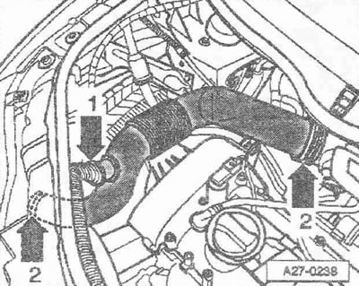 Снять резонатор на шланге воздуховода «стрелка 1», для этого нажать кнопки фиксатора. Снять воздуховод, для этого ослабить пружинные хомуты «стрелки 2» клещами для шланговых хомутов «V.A.G 1921».