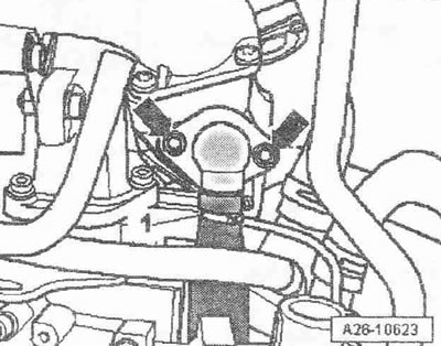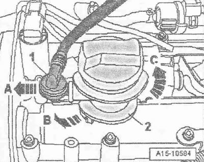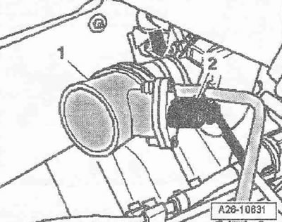 Отсоединить разъем «2» расходомера воздуха «G70». Снять хомут «стрелка» и снять штуцер «1» с расходомером воздуха «G70».