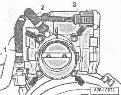 Установка в обратном порядке, при этом необходимо заменить прокладки. Для крепления всех соединений шлангов использовать хомуты соответствующей серии. Установить блок дроссельной заслонки. Установить канал приточного воздуха.