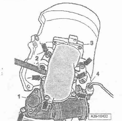 Снять шланг «2» с абсорбера. Выкрутить болты «стрелки» и снять опору впускного коллектора «3». Отсоединить разъём «4» и снять клапан рециркуляции ОГ «N18» с потенциометром системы рециркуляции ОГ «G212».