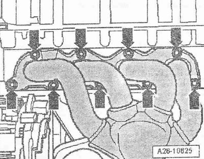 Выкрутить гайки «стрелки» и снять выпускной коллектор.