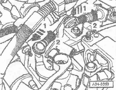 Потянуть вперед предохранительный механизм троса переключения и троса выбора передач до упора в «направлении стрелки 1». Повернуть сдвижную втулку в «направлении стрелки 2» до упора и зафиксировать сдвижную втулку. Трос должен передвигаться в фиксаторе. Зафиксировать вал переключения передач следующим образом.