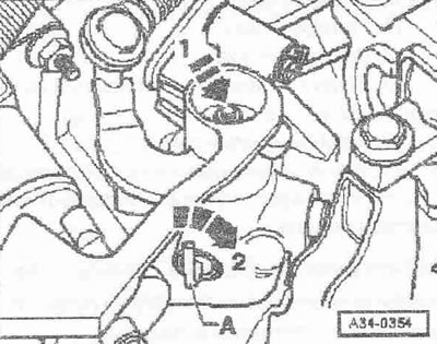 Переместить рычаг переключения передач в «направлении стрелки 1» вниз для установки на дорожку 1 «й/2» й передач. При отжатии вала переключения прижать стопорный палец «А» слегка в направлении вала переключения и затем повернуть стопорный палец «А» на 90° в «направлении стрелки 2» до его ощутимой фиксации. При этом происходит стопорение вала переключения, который больше не перемещается.
