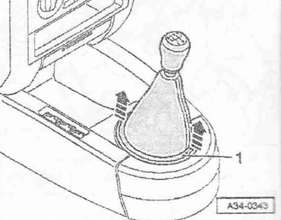 Приподнять крышку рычага переключения «1» в направлении стрелки от центральной консоли. Вывернуть кожух вверх поверх рукоятки.